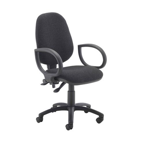 This Jemini Plus Operator Chair has a high back for improved comfort and posture for up to 8 hours at your desk. The back height and angle is adjustable and can be either fixed or free floating. The seat height is also adjustable from 460mm to 590mm. The padded seat and back are upholstered in charcoal fabric and the chair comes on a black plastic 5 castor base (an optional chrome base is available separately).