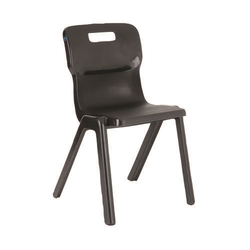 Ideal for classrooms, this Titan one piece polypropylene chair conforms to BS EN15373:2007 parts 1 and 2. The one piece chair is screw-free and features a unique S shaped back, and an anti-tilt design for comfort. This pack contains 1 charcoal chair with a seat height of 310mm.